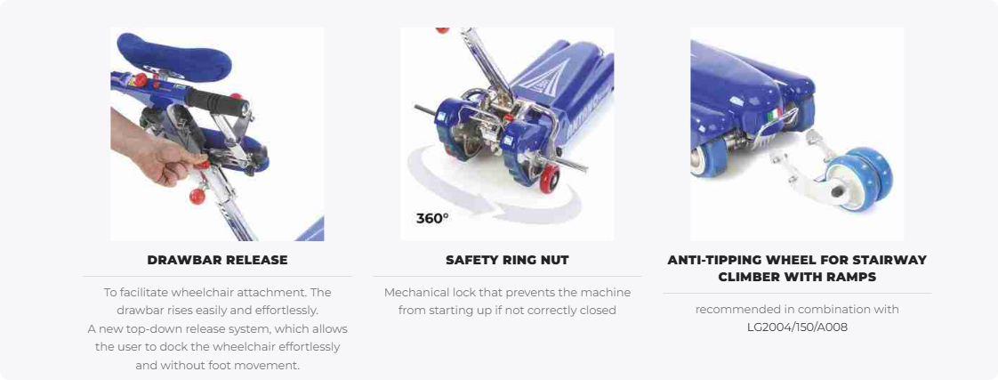 Technological innovation, the approach to the patient and attention to aesthetic details are what have made the LG2004 stairway climber so successful over the years. Today the new version offers all of the characteristics developed in eight years of on-going product design and evolution. Unbeatably easy to use, thanks to the patented manoeuvring system that allows the stairway climber to spin and turn in tight spaces effortlessly.
