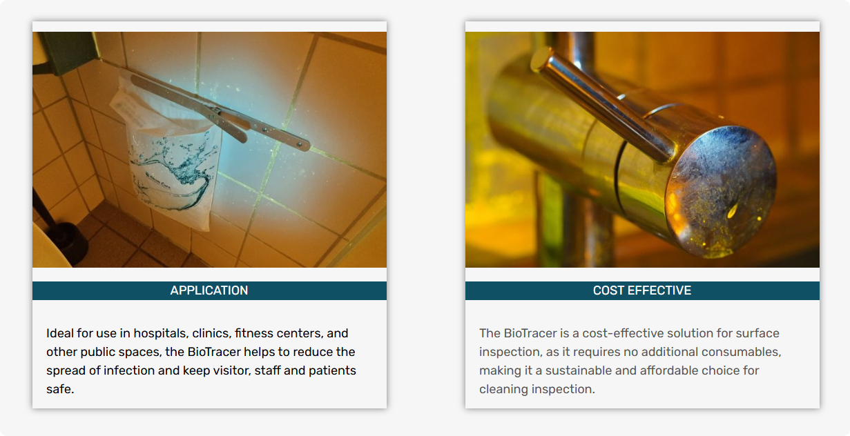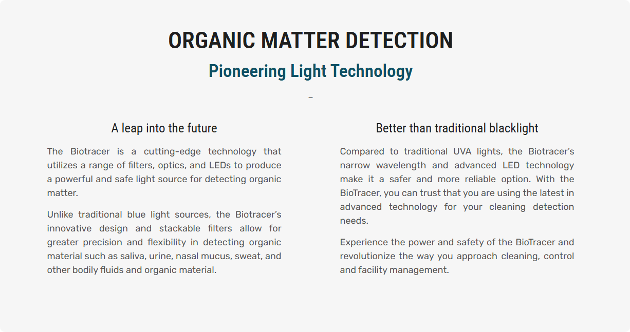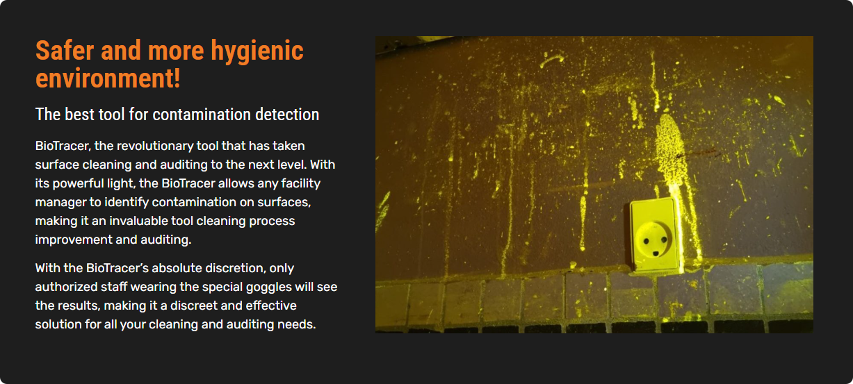 Originally designed for crime scene investigation, the BioTracer has been improved and adapted for use in the healthcare and facility management industries to ensure the highest levels of cleanliness and infection control.